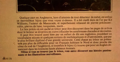 | Quelque part en Angleterre, hors d'atteinte de tout détecteur de métal, est enfoui ce merveilleux bijou que vous voyez ci-dessus. Il a été ciselé dans de l'or par Kit Williams, l'auteur de Mascarade, et superbement rehaussé de pierres précieuses : rubis, pierres de lune, turquoises, nacre...
